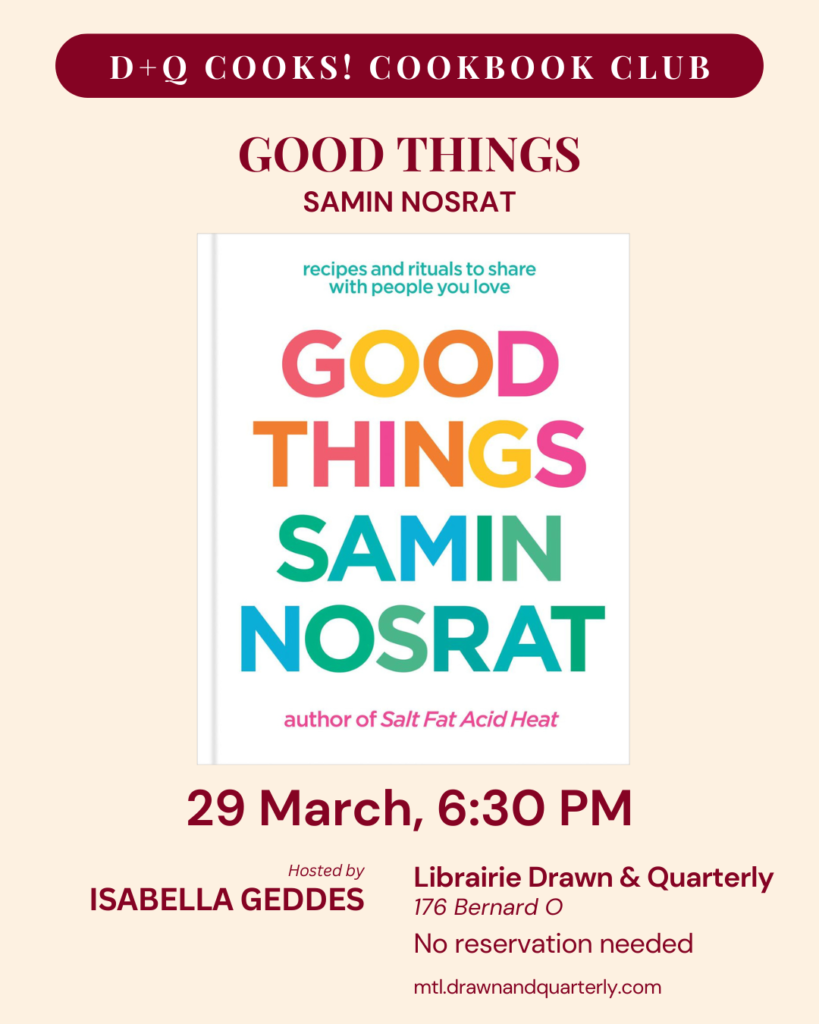 Librairie Drawn & Quarterly will be hosting their famous D+Q Cooks! Cookbook Club. The March 29 edition of the club will focus on Good Things by the love of my life, Samin Nosrat, author of Salt, Fat, Acid, Heat. This event round-up is dedicated to you Samin Nosrat, a woman I probably will never meet. Every halfway decent meal I’ve ever cooked, I owe to you. Thank you.