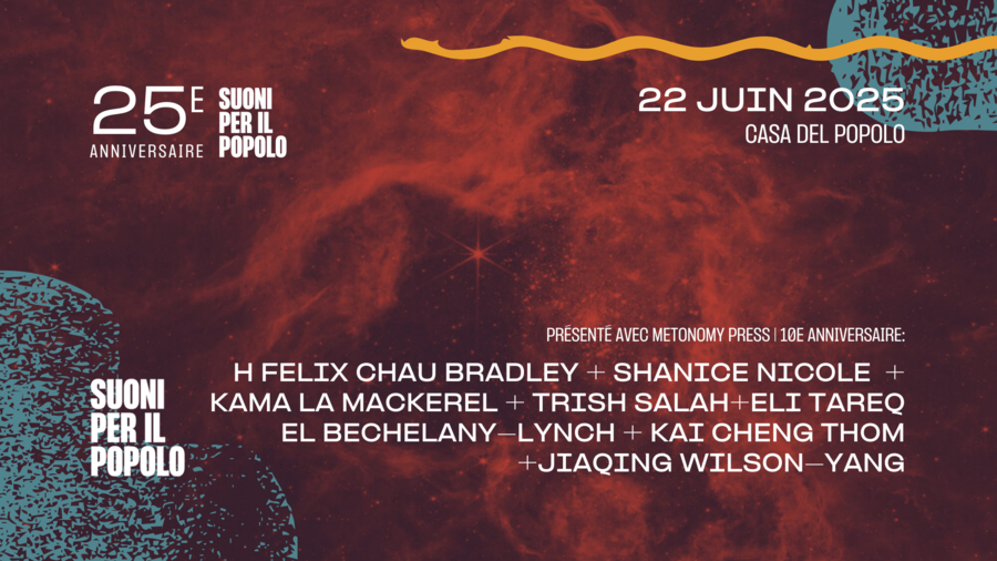 Speaking of local happenings, as part of the Suoni Per Il Popolo festival, Metonymy will be throwing an anniversary party! Head to Casa del Popolo on Sunday, June 22 for 10 Years of Metonymy Press: A Cabaret (doors open at 7:30 pm and the show starts at 8 pm). Tickets are on sale now: $15 or PWYC, no one will be turned away. The show will be hosted by Kama La Mackerel and Kai Cheng Thom, featuring performances from H Felix Chau Bradley, Shanice Nicole, Trish Salah, Eli Tareq El Bechelany-Lynch, and jiaqing wilson-yang. In addition to the cabaret, Metonymy is currently offering four thematic Anniversary Book Bundles with a selection of the press’ titles.